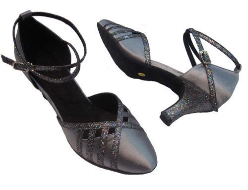 Gabriele Grey shoe is a traditional style and are grey satin covered with a dark rainbow trim.