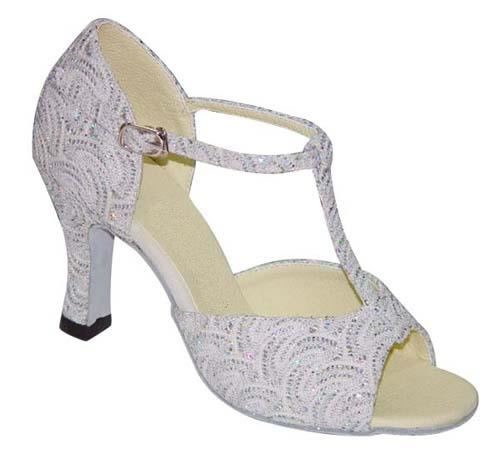WHITE Lace fabric with sparkle inserts - T-bar angle strap, Suede Sole