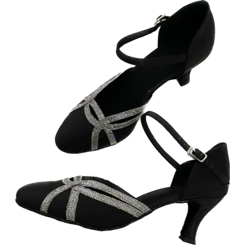 Beth black shoes is a traditional style and are black satin covered with a silver sparkle trim.