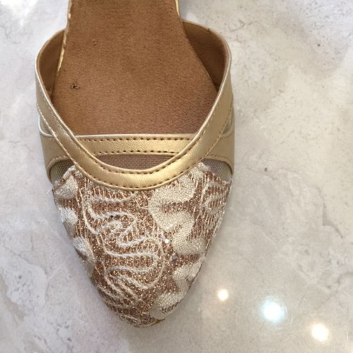 Gold Lace  Sparkle fabric with soft gold  trim . A closed toe always lends to an air of formality.