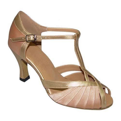 TAUPE SATIN / GOLD - Double T-Bar Strap and Peep Toe, Suede Sole.
