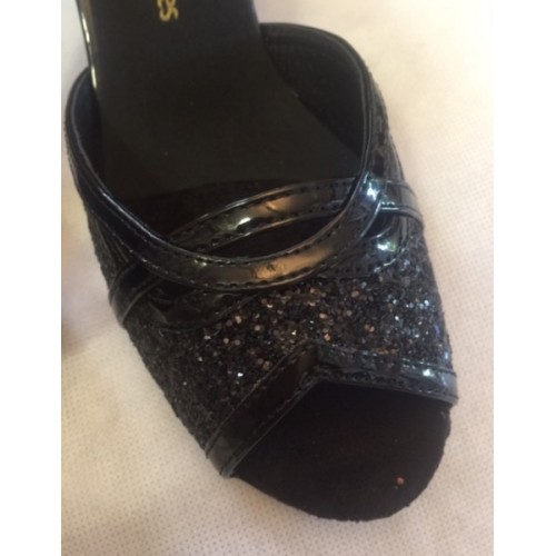 BLACK SPARKLE with Black Patient Trim - Ankle Strap and peep Toe, Suede Sole.